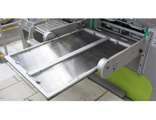 - 涡轮曲柄带动肘杆式高精度平面模切下工作台;